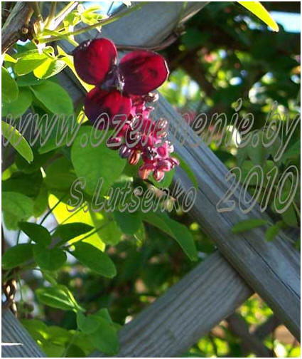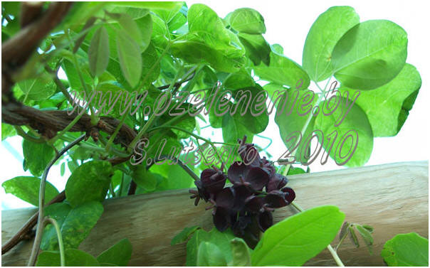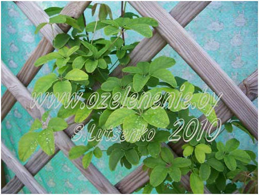 Акебия. Одно из новых в нашей культуре растений. Лист акебии похож на лист комнатной шеффлеры – состоит из пяти овальных листочков. Соцветия цвета красного вина (на солнце) или темно-лиловые (в тени) состоят из нескольких крупных женских и нескольких мелких мужских цветков. Акебия зацветает примерно на 4-й год после посадки и цветёт очень обильно. Лиловые мясистые плоды акебии – съедобны, однако завязываются крайне редко. Эта рослая лиана очень декоративна в любое время года, а не только во время цветения. Она станет необычным, ажурным украшением для деревянной перголы или настенной решётки. Хочу отдельно предупредить - акебия - теплолюбива и посадить ее нужно в защищённом месте. Акебия - листва.