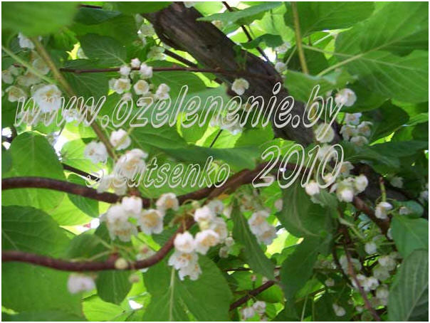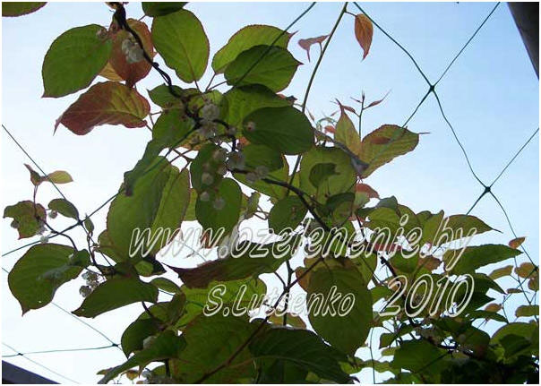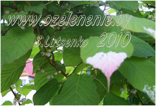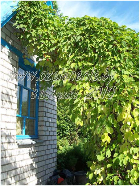 Актинидия. Выращивают актинидию ради вкусных, съедобных плодов – маленьких киви. Эта теплолюбивая лиана, родом из Новой Зеландии, уже прочно обосновалась на наших участках, и умудряется давать неплохие урожаи. Для того чтобы актинидия плодоносила, необходимо высаживать одно мужское растение на 2-4 женских. Хотя, в последнее время в селекции появились и самоплодные сорта. Давно знакомая нам А. коломикта созревает в сентябре. Но если вы приобрели саженцы новых сортов, в том числе – крупноплодных, – и глубокой осенью плоды ещё выглядят незрелыми, не отчаивайтесь. Соберите урожай, и ягоды дозреют дома, в миске, за 1-3 дня. Актинидия – мощная, тяжелая лиана, поэтому опору для неё нужно строить крепкую и устойчивую, естественно, не металлическую (металл – слишком холоден зимой). Старайтесь посадить актинидию подальше от живых деревьев, потому что, обвившись вокруг дерева, лиана может его задушить. Этим растением можно увить садовую беседку или перголу – плотная зелень надёжно защитит вас от ветра и дождя. Актинидия коломикта в цвету.