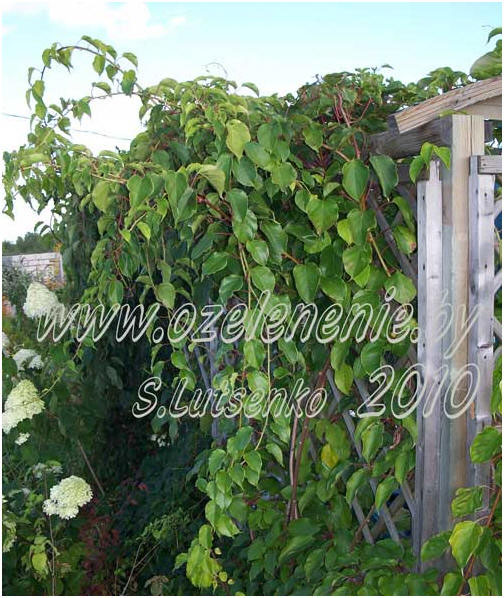 Актинидия аргута на беседке. Вы видите здесь беседку? Эта лиана мощнее коломикты, имеет более крупные ягоды. но в плодоношение вступает позже. И, в отличие от А. коломикты, урожай А. аргуты сильно зависит от зимних и весенних температур. (На переднем плане - гортензия Грандифлора в цвету.)