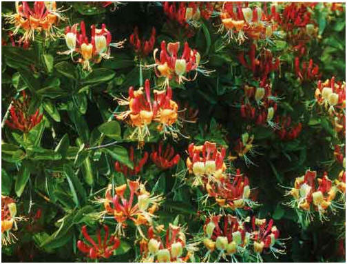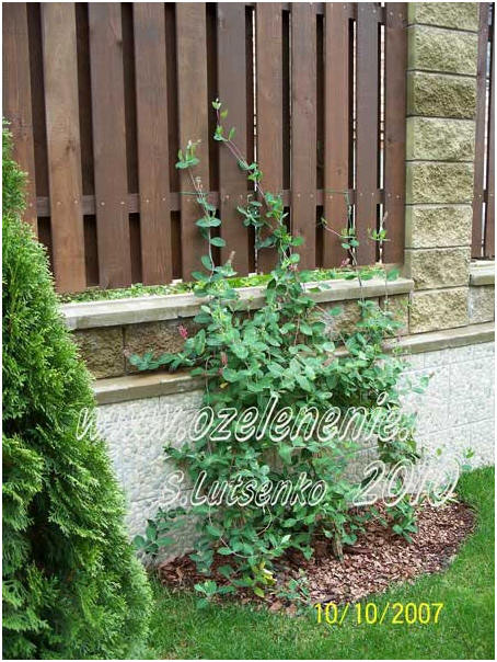 Жимолость вьющаяся. Жимолость каприфоль хорошо растёт в полутени, поэтому ей с успехом можно украсить северную или западную стену. Вьётся по любой тонкой опоре – металлической или пластиковой сетке, шнуру. В июне жимолость каприфоль – это обильно цветущий желто-розовый куст, очень яркий и красивый. Ближе к осени на нём появляются плоды – привлекательные ярко-оранжевые шарики. Если у вас есть маленькие дети – будьте особенно осторожны, - красивые ягодки – ядовиты. Жимолость Брауна отличается мелкими оранжевыми или алыми, без запаха, цветками, и более продолжительным сроком цветения. Жимолость японская – более теплолюбива, листья её могут не опадать на зиму, а у сорта «Aureoreticulata» зелёные листья украшает мелкая сеточка из золотистых жилок. Жимолость каприфоль - молодое растение.