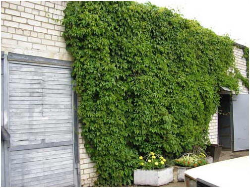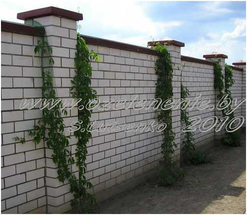 Давайте поговорим сегодня о тех растениях, которыми можно украсить ограду, беседку, арку, перголу, или задекорировать не самую привлекательную стену хозяйственной постройки. Вы правильно поняли – речь пойдёт о вьющихся растениях (лианах) и плетистых (лазающих лианах). Романтики с любовью называют их: «зелёные кудри сада». К вьющимся растениям относятся съедобные и декоративные винограды, актинидия, жимолость декоративная (каприфоль, Брауна, японская), кирказон, горец, акебия, лимонник китайский, клематис. Это – многолетние растения, которые самостоятельно взбираются на различные виды опор, и закрепляются на них. Разрастаясь с каждым годом всё сильнее, лианы формируют плотный, пышный куст, который полностью скрывает листвой свою опору. Но, как известно, любая лиана первые два года после высадки на постоянное место растет очень медленно! Это связано с тем, что сначала она наращивает мощную корневую систему, и только потом выбрасывает сильные молодые надземные побеги (вдумайтесь – обычный взрослый куст клематиса имеет 8 м³ корней!). Поэтому, посадив у ограды веточку клематиса, лимонника или винограда, мы терпеливо ждем, когда же она начнет расти и, наконец, заплетёт этот ужасный забор! Чтобы решить проблему быстрее, можно воспользоваться на это время вьющимися однолетниками, такими, как: хмель, ипомея, кобея, тунбергия, вьющаяся настурция, душистый горошек, фасоль. Семена этих и других вьющихся однолетников можно приобрести в любом специализированном магазине, и высеять весной, как указано в инструкции на упаковке. Лазающие растения своими побегами не обвивают опору, а карабкаются вверх, прижимаясь к ней. Гортензия черешковая, например, удерживается на деревянной поверхности при помощи коротких воздушных корней; а плетистую розу и вовсе – нужно направлять и подвязывать. Среди упомянутых здесь многолетних растений есть исключительно декоративные (красивоцветущие, красиволиственные), есть съедобные и даже лекарственные. Каждое растение имеет свои особенности и требования к условиям произрастания. Коротко расскажу о каждом из них. Виноград девичий пятилисточковый. Быстрорастущая, неприхотливая лиана. Плоды – мелкие, жесткие, в пищу не употребляются. Листва летом - сочного зелёного цвета, осенью становится багряной, на зиму – опадает. Виноград девичий не вымерзает даже на металлической опоре, поэтому им можно задекорировать, например, забор из сетки Рабица (см. фото). По деревянной, кирпичной или оштукатуренной опоре эта лиана поднимется самостоятельно, пользуясь усиками – «присосками», на высоту более 10 метров. Небольшое строение может укрыть полностью. Чрезмерный рост винограда девичьего можно сдерживать при помощи обрезки. К почвам, ветрам и освещенности это растение нетребовательно, растёт везде. Размножается отводками и черенкованием. Я бы порекомендовала с осторожностью высаживать «дикий виноград» возле стен жилых домов, потому что его «усы» проникают в микротрещины, а плотная листва летом препятствует испарению лишней влаги со стен. Таким образом, хоть и незначительно, но ускоряется процесс разрушения. В целом же, виноград девичий пятилисточковый – самое подходящее растение для того, чтобы без лишних хлопот спрятать на участке какой-либо неприглядный объект, или сделать сетчатую изгородь непрозрачной. Виногра