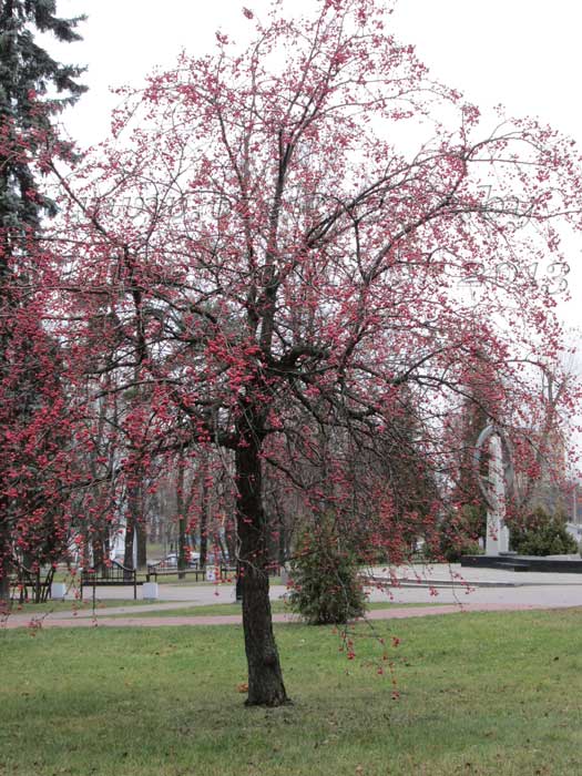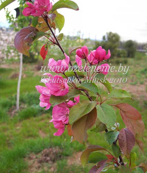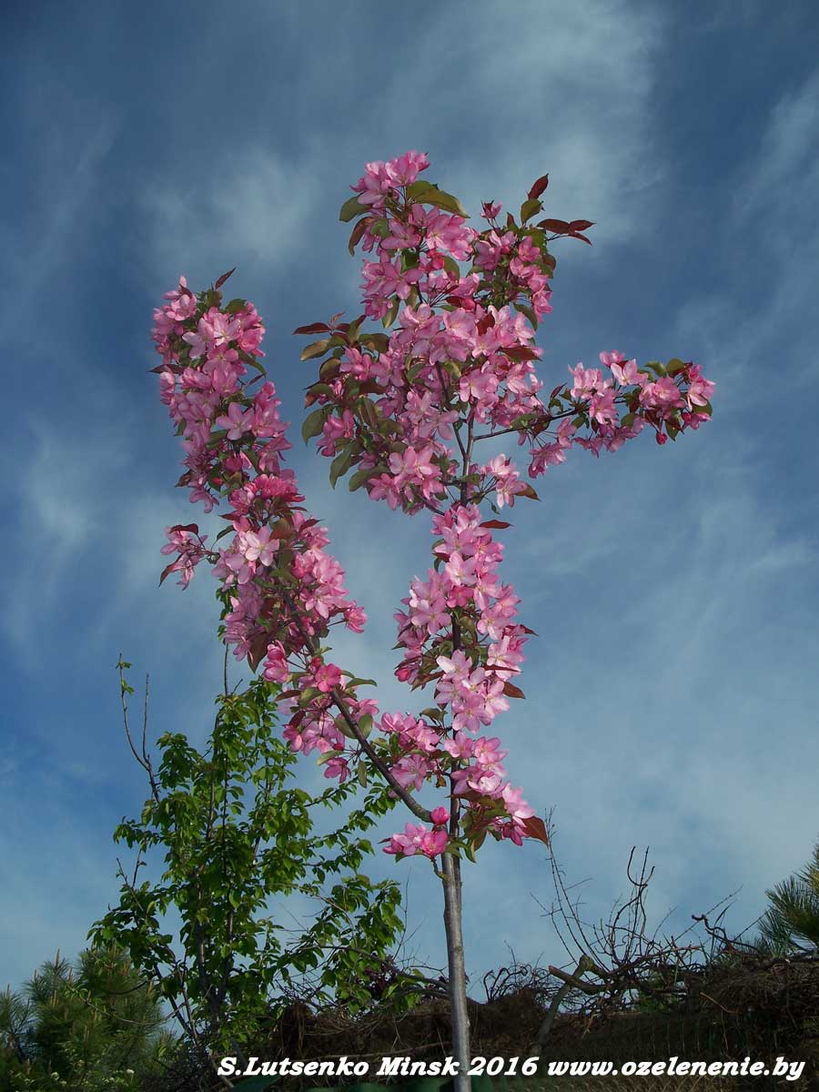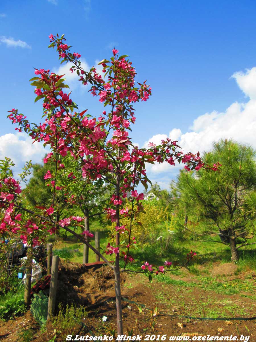 Каталог деревьев и кустарников для Минска и Беларуси (А-Я)Яблоня (malus)Яблони у нас, без преувеличения, есть в каждом саду. В основном мы выращиваем их для получения плодов. Уверена, что почти каждый мой соотечественник-садовод знает о яблонях всё. Тех, кто не знает, или хочет узнать больше - приглашаю на курсы садовников (см. страницу "Курсы"). Там мы со слушателями подробно разбираем все вопросы, касающиеся плодового сада. А здесь хочется представить вам яблони, которые по-настоящему украсят ваш сад в течение всех 4-х сезонов. Яблоня Недзвецкого и её гибриды. (malus niedzvediana)Наше видео: https://www.youtube.com/watch?v=QRecCFIwV2o -Яблоня-Китайка. Яблоня Недзвецкого - природный (естественный) гибрид дикой (ягодной)яблони и боярышника. Поэтому она сочетает в себе признаки обоих растений. Плоды мелкие, но, безусловно, съедобные. Яблоня Недзвецкого может сформироваться, как дерево, или стать кустом. На молодом растении вы заметите листья сразу двух типов: листья яблони и боярышника, одновременно. Через несколько лет резные листочки боярышника перестанут появляться. Яблоня Недзвецкого имеет две формы: зелёную (с белыми цветами и жёлтыми плодами) и пурпурную (с розовыми цветами и яблочками малинового цвета). Гибриды, полученные на основе яблони Недзвецкого и других диких яблонь отличаются более крупными цветами и плодами, однако они более прихотливы, в то время, как сама Яблоня Недзвецкого принимает, как должное, любые предложенные ей условия. Только не высаживайте пурпурную форму в тень, иначе листья приобретут зелёный цвет. Саженцы яблони Недзвецкого у меня есть, а как же! Такая красавица должна заселять наши сады!
