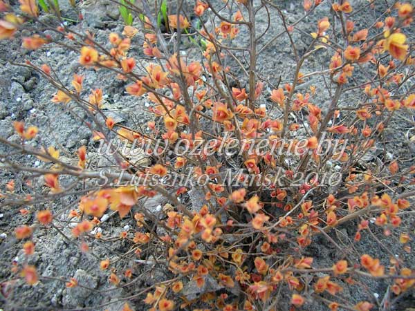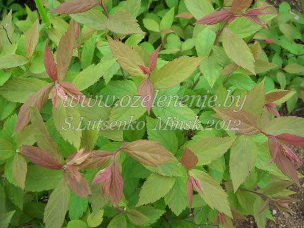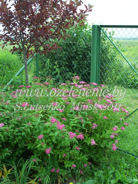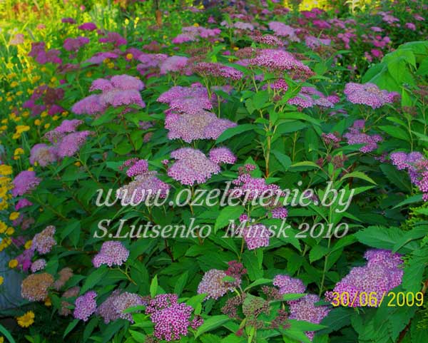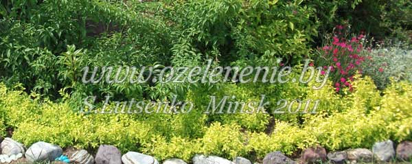 Спирея японская, бумальда (spiraea japonica, bumalda)Самый живучий, самый выносливый, самый, самый, самый... и самый же распространенный кустарник в нашей стране - спирея японская. Средний рост куста спиреи японской около 80 см. Этот кустарник любит стрижку, которую необходимо производить сразу после отцветания. А цветет спирея японская довольно долго, более месяца. Причем как раз в тот период (конец июня - июль), когда весенне-цветущие кустарники уже "отыграли", а осенние - ещё не подготовились. Сорт спиреи японской "Энтони Ватерер" я выделяю из других потому, что он не даёт нам соскучиться. Он так изменчив, что в разные поры года выглядит совершенно иным. А перед листопадом становится багряным. Сорта спиреи японской с желтыми листьями, показанные здесь, отличаются окраской. Спирея японская "Голдмаунд" ('Goldmound') - лимонного цвета. Такой она распускается весной, и остается до поздней осени. А спирея "Голдфлэйм" распускается оранжевой. И до самого цветения молодые листочки у этого куста окрашены в яркий оранжево-красный цвет (на фоне взрослых, желтых листьев). В августе же, после цветения, этот сорт зеленеет. Завершает сезон спирея 'Goldflame' розовой окраской листвы. Спирея бумальда "Криспа" отличается ярко окрашенными цветами, зубчатыми листьями, и оригинальным молодым приростом бело-розового цвета.