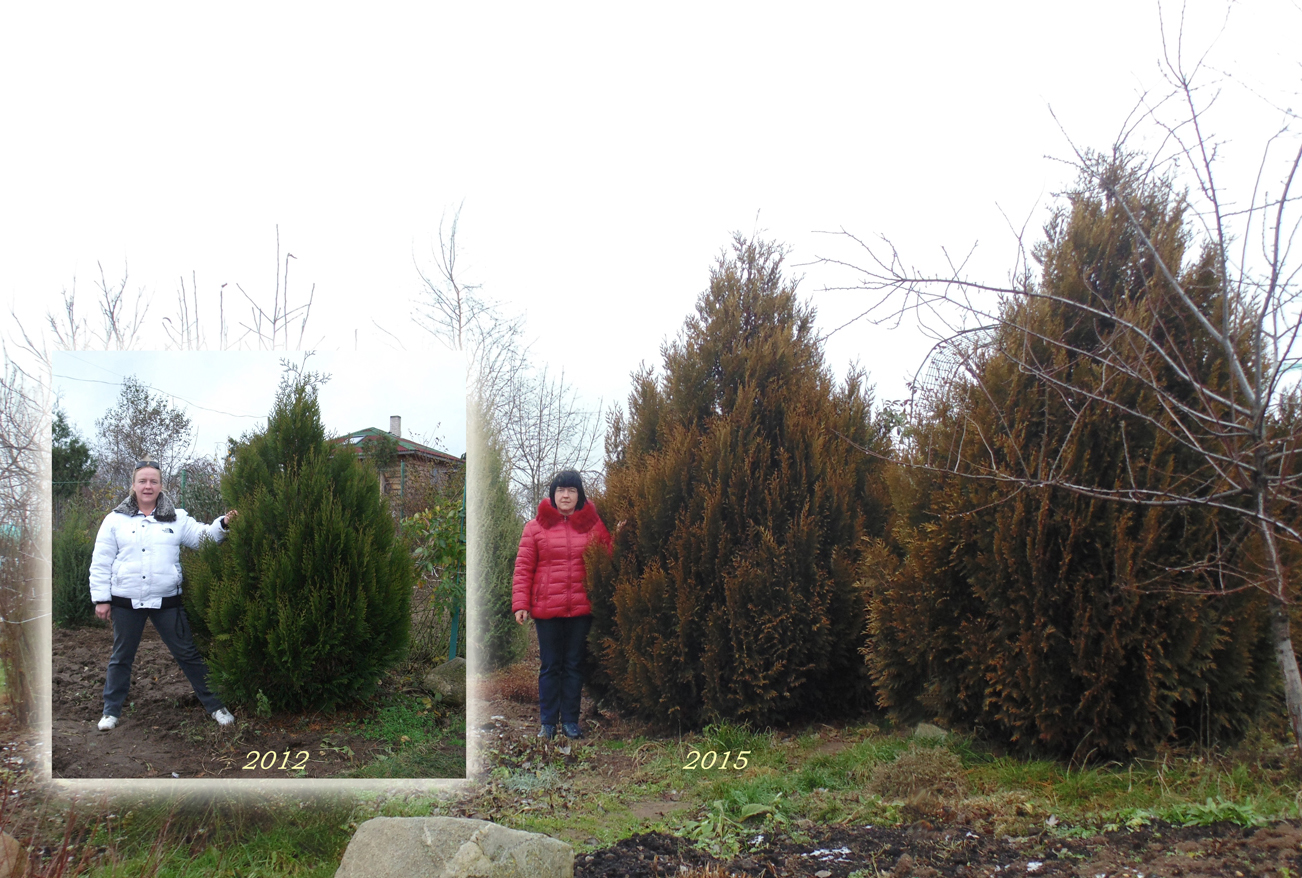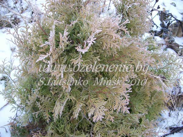 Туя западная "Рейнское золото" (Рейнгольд, золото Рейна), "Санкист", "Желтая лента" (thuja occidentalis 'Rhaingold', 'Sunkist', 'Yellow ribbon')Самый яркий среди желтоокрашенных сортов туи - безусловно сорт туи западной 'Rhaingold'. Это компактная, медленнорастущая туя, которая к своей глубокой старости не достигнет и 4-х метров в высоту. Более крупные и рослые туи - 'Europe gold' и 'Yellow Ribbon'. Их яркая окраска так же добавляет живой цвет в зимнюю, черно-белую гамму. Но желтого цвета в ландшафтных композициях из растений должно быть немного. Ассоциации с осенью мало кого радуют. Поэтому, не переусердствуйте с желтыми туями. Сорт туи западной 'Sunkist', (из моего опыта) довольно теплолюбив. Рекомендую использовать его только в тёплых, защищённых от ветра уютных двориках. Этот сорт нравится многим людям за то, что желтая макушка Санкиста окрашена в самый яркий цвет, по сравнению с остальными желтыми туями.