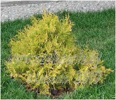 Туя западная Рейнгольд (Rhaingold) она же "Рейнское золото" или "Золото Рейна". Молодой саженец. Лето.