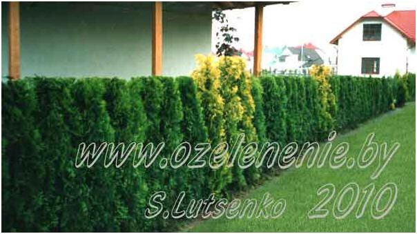 Живая изгородь из туи Брабант защитит от ветра и спрячет от посторонних глаз.