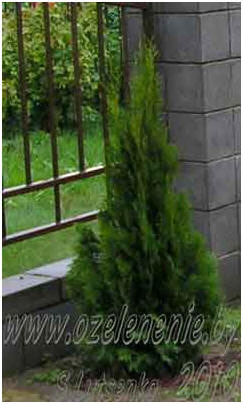 Вы можете, так же купить тую «Columna». Из названия понятно, что форма её – колонновидная (ширина кроны невелика, и одинакова по всей высоте растения). С практической точки зрения, от «Smaragd» её отличает округлая форма веточек, чуть более рыхлая крона и обилие мелких шишек; причем шишки появляются даже у довольно молодых растений.