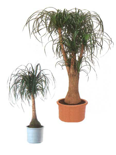 Статьи о ландшафтном дизайне и растениях Самые неприхотливые.(Растения в интерьере)Фотографии наших работ смотрите ЗДЕСЬ. Я хочу посвятить эту статью комнатным растениям. О чём вы сейчас подумали? Наверняка кто-то вспомнил бабушкины фиалки, вездесущую пеларгонию, или, в крайнем случае, любимый кактус. Тоже неплохо. А быть может, у вас на подоконнике – целый «ботанический сад», как и у меня? Впрочем, разных растений так много… Например, нолина (бокарнея). Это элегантное растение я смело порекомендую новичкам и очень занятым людям. Единственное, что требуется нолине – это достаточно светлое помещение, - не слишком сухое, и не слишком влажное. Поливать её нужно изредка, когда почва в горшке подсохнет. Нолина запасает влагу в толстом стволе – недаром её иногда называют «слоновья нога», кстати, - «нога» очень красивая и изящная. Она же позволит вам отличить нолину от других внешне похожих, но более прихотливых растений – юкки и драцены. Ствол молодой нолины имеет форму шара, сначала – размером с горошину, а затем – с кулак, или чуть больше. На макушке этого «деревянного шарика» - букет узких, длинных, завивающихся листьев. Потом бокарнея начинает вытягиваться, у неё формируется ствол. Однако, шаровидное утолщение внизу всегда остается заметным (см. фото). Нолина не любит опрыскивания, ей нужны только полив и подкормка. И ещё - не стоит располагать это растение вблизи отопительных приборов – из-за сухого воздуха кончики листьев могут подсыхать. Нолина. Растение взрослое (справа) и помоложе (слева).
