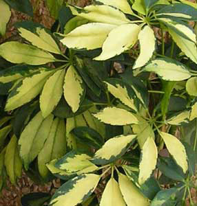 Шеффлера – оригинальное и очень выносливое растение. Листья – «ладошки» оригинальны даже у зеленой шеффлеры. А пестролистная форма – просто притягивает восхищённые взгляды, поднимает настроение! Светлая и прохладная (12-20º С) комната придётся ей по вкусу. Землю в горшке с шеффлерой надо поддерживать во влажном состоянии, а листья периодически опрыскивать. Если вы все-таки недоглядели, и шеффлера сбросила листья – поухаживайте за ней, и она обязательно восстановится. В этом цветочном горшке не одно, а несколько растений. У шеффлеры довольно тонкий и высокий ствол, поэтому она нуждается в дополнительной опоре. Высаженные группой, растения успешно поддерживают друг-друга, а заодно образуют пышный, густооблиствлённый куст.