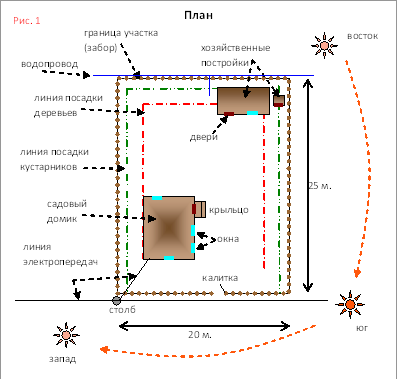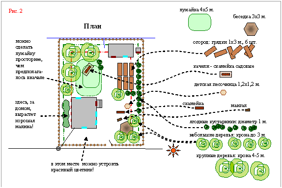Делайте всё в масштабе, иначе ваша работа потеряет смысл. Самый удобный масштаб: 1:100, то есть в 1 сантиметре чертежа - 100 сантиметров (1 метр) территории. Если ваш участок – пять «соток» шириной 20 метров, и длиной 25 метров, то у вас на листе получится прямоугольник 20 Х 25 см. Не сложно, не правда ли? Теперь разместите на участке дом и хозяйственные постройки. Обозначьте все двери и окна! Не забудьте отметить, где проходит линия электропередач, газопровод, водопровод, другие подземные и надземные коммуникации. Сориентируйте свой план по сторонам света – это очень пригодится вам при расстановке элементов и подборе растений. Компас покупать не обязательно: ровно в полдень солнце всегда находится на юге. Еще одна деталь: в садовых товариществах существуют нормы – минимальные расстояния от границ участка, на которых разрешается высаживать разные виды плодовых растений. Для ягодных кустарников такое расстояние составляет 1 м. (проведем на плане зеленую линию); для косточковых культур (вишня, слива, алыча), а так же для декоративных растений требуется отступить два метра, тогда как яблони и груши высаживаются не менее, чем в трёх метрах от соседских участков (красная линия на нашем плане). Запрещено высаживать деревья ближе 2-х метров от газопровода – не игнорируйте, пожалуйста, эту норму безопасности. Теперь давайте уточним, что именно мы хотим иметь на своём дачном участке. Послушаем всех заинтересованных членов семьи: бабушка требует огород, папа мечтает о беседке с мангалом, маме нужно уютное местечко, где можно спокойно позагорать. А самому маленькому понадобится собственное место для игр. Естественно, имея дачу, хочется собирать свой урожай яблок, клубники и смородины. И неплохо было бы... хотя бы маленький... малюсенький прудик. Если территория позволяет, задача решается легко; но как уместить такое количество разных элементов на одном небольшом дачном участке? В первую очередь, определимся с размерами. Какая площадь, отведенная под огород, будет для вас достаточной? Беседка какого размера способна вместить вашу семью? Если вам трудно представить себе эти размеры заочно, используйте простой прием. Соберитесь вместе, к примеру, на обычной кухне. Площадь кухни нетрудно измерить. Оцените теперь, хватит ли вам беседки такого размера, или стоит добавить несколько метров. А, может, наоборот, вас вполне устроит половина этой площади. Впрочем, в стандартной беседке 3х3 м. вшестером вы будете чувствовать себя очень уютно. Таким же способом можно определить размер огорода, лужайки, детской площадки. Теперь на отдельном листе бумаги в том же масштабе, в котором выполнен основной чертёж, изобразим выбранные элементы (рисунок 2). Вырежем, и разложим их на плане. Немного терпения, и всё получится! Объясню, почему я решила спланировать этот участок именно так, как вы видите на рисунке. Ко всем входам нужно обеспечить свободный доступ. Поэтому, проход от калитки к дому и сараю мы ничем не перегораживаем. Самые крупные деревья ставим таким образом, чтобы они не затеняли участок. Я нарочно изобразиа кроны деревьев сразу большими, чтобы при планировании разместить их на достаточном удалении друг от друга. Для высокорослых деревьев (на семенных подвоях), рекомендуемое расстояние составляет 5-6 м., для среднерослых – 4-5м., «карликам» хватит 3-4 м. Небольшие деревья