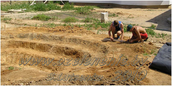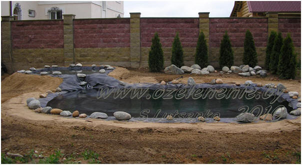 Сегодня мы часто слышим выражение: «плёночный водоем». Это пруд или ручей, вода в котором удерживается, благодаря специальной плёнке – мембране. Прудовые плёнки бывают разными. На сегодняшний день лучшей считается мембрана из бутилкаучука. Она наиболее эластична и долговечна, прослужит десятки лет. Оптимальная толщина бутилкаучуковой мембраны – 1,0 мм. Стоит она 12-14 евро за 1 м ². Ширина полотна 3 метра. Её можно склеивать специальным двусторонним скотчем, но к нам её привозят уже склеенную, любой ширины, кратной трём (3, 6, 9, 12 м.). Как узнать, сколько плёнки нужно приобрести? Рассчитаем по формуле: Длина плёнки = длина пруда + две глубины + 100 см. Ширина плёнки = ширина пруда + две глубины + 100 см. Более экономичный вариант – прудовые пленки ПВХ. Их стоимость колеблется в пределах от 3 до 15 долларов за 1 м ². Толщина 0,5; 0,8и 1,0 мм. Они не так эластичны, как бутилкаучуковые, зато значительно дешевле, и расцветку можно подобрать на свой вкус: черную, коричневую, темно-синюю, тёмно-зелёную. Дно неглубокого водоема будет просвечиваться, и выглядеть весьма натурально. Такая плёнка прослужит вам более 10 лет, постарайтесь только не повредить её в процессе эксплуатации. Она так же устойчива к ультрафиолету и выдерживает морозы до -30º. В своей практике я сталкивалась с водоёмами, гидроизоляция которых была выполнена обычной полиэтиленовой плёнкой, уложенной в несколько слоёв. Эти водоёмы были сделаны много лет назад, и выглядели абсолютно естественными. Их дно было засыпано слоем гравия и речного песка примерно 10-15 сантиметров. Вода стала уходить, когда новый хозяин решил немного раскопать один пруд, и вытащил наверх «целую кучу старой плёнки». Наши далёкие предки тоже делали искусственные водоёмы. Они выкапывали котлован и обмазывали его изнутри толстым слоем размоченной глины. Затем глину засыпали небольшими камнями, гравием и сильно утрамбовывали. Глина очень хорошо задерживала воду, камни укрепляли чашу пруда; а чтобы глину не вымывало, дно засыпалось промытым речным песком. Так что, - всё возможно, - главное найти подходящий вариант. Придумав калькуляторы, мы перестали считать на счётах; а изготовив современные материалы для устройства водоёмов, постепенно перестаём применять допотопные технологии. Мировые новинки, вроде напыления жидкого гидроизолирующего покрытия, до нас пока не дошли. И самым практичным и доступным способом устройства среднего или даже большого пруда на сегодняшний день является применение мембраны. Расскажу об этом подробнее на примере устройства декоративного двухуровневого водоёма.