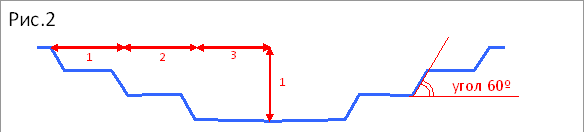 Пожелания заказчика: пруд прямоугольной формы, с фонтаном и водопадом. Размер основного пруда 3,5 Х 5 м. Глубина – около 1 м. В работе нужно максимально использовать имеющиеся камни (эх, я бы предпочла другие, но условие таково, что поделаешь!), а в материалах и растениях – красный и розовый цвет. Около пруда должно быть место отдыха со скамейкой. Итак, приступаем: На плане участка размешаем пруд (рис.1). Прямоугольная форма – это красиво, но с общей концепцией благоустройства и озеленения участка не совпадает. Поэтому слегка закругляем углы. К основному пруду присоединяем дополнительный, маленький. Этот пруд будет немного приподнятым, из него и будет вытекать водопад. В большом водоеме установим фонтан. Значит, водяным лилиям в нём будет не слишком уютно – эти растения предпочитают более спокойную воду и немного тени. Поэтому лилии высадим в верхнем пруду. Лёгкую тень обеспечим миниатюрными оригинальными деревьями (1/3 пруда должна быть притенена), тогда пруд хорошо выглядит и, как живой организм, чувствует себя лучше. Рассчитываем глубину пруда: глубина должна составлять 1/6 меньшего измерения (ширины) или 1/3 радиуса пруда. Такое соответствие соблюдается потому, что мы не бетонируем котлован и нужно, чтобы под плёнкой грунт не осыпался. При более крутом наклоне возможны повреждения весной, после оттаивания грунта (рис.2) Размер пруда у нас 3,5 Х5 м., значит глубина 3,5 / 6 = 0,6 м. Копаем котлован. Грунт оказался глинистый, тяжёлый, и очень сильно утрамбованный машинами во время стройки. Можно немного увеличить глубину пруда, до 0,75м. Рельеф дна плёночного пруда.