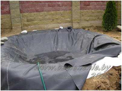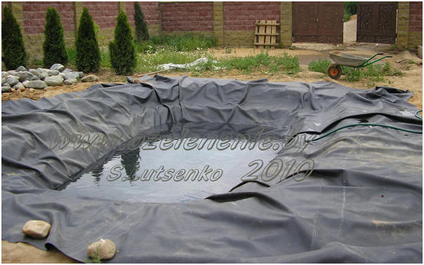 Укладываем мембрану (аккуратно, чтобы при перетаскивании фетр под ней не скрутился). Там, где необходимо, делаем складки. Края плёнки пока закреплять не надо. Сначала наполним пруд водой, чтобы плёнка приняла нужную форму, прижалась к дну и стенкам чаши пруда, не растягиваясь (фото3).