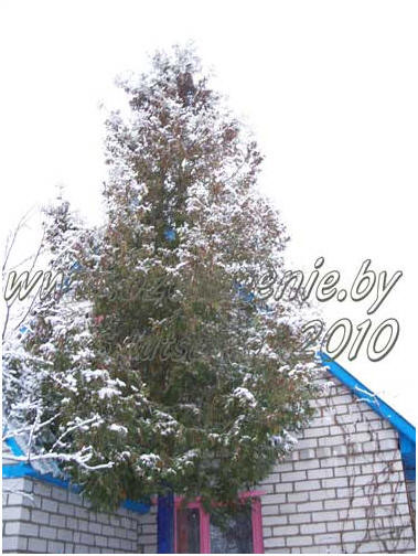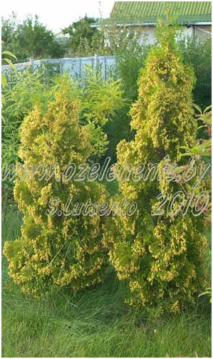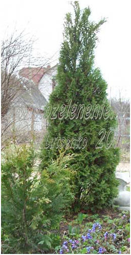 Вы можете, так же купить тую «Columna». Из названия понятно, что форма её – колонновидная (ширина кроны невелика, и одинакова по всей высоте растения). С практической точки зрения, от «Smaragd» её отличает округлая форма веточек, чуть более рыхлая крона и обилие мелких шишек; причем шишки появляются даже у довольно молодых растений.