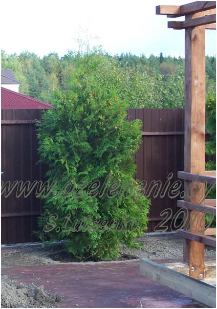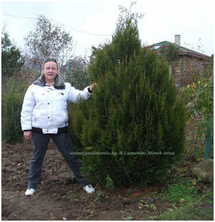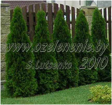Статьи о ландшафтном дизайне и растениях Зимой и летом...Статья + фотографии молодых и взрослых туй разных сортов.Больше информации - в нашем Каталоге растений. Да, мы любим хвойные вечнозелёные растения именно за это. Они радуют глаз зеленью в любое время года, и даже тогда, когда другие растения становятся прозрачными и незаметными. А ещё они такие разные... Есть среди них огромные деревья, кустарники и даже ползучие, так называемые «ковровые» формы, высота которых не превышает 15 сантиметров. Хотя большинство видов имеет привычный зелёный цвет, сейчас всё чаще встречаются сорта с серебристой, серой, голубоватой и даже жёлтой хвоей. Наверняка всем известно такое растение, как туя. В Беларуси распространена туя западная (есть и другие виды, например, туя восточная, но она более теплолюбива). Саженцы туи продаются во всех питомниках и садовых центрах, и выглядят молодые растения примерно одинаково, хотя названия на ценниках написаны разные. Самой популярной и красивой считается туя сорта «Smaragd». Она же считается и наиболее дорогой. На самом деле, это аккуратное деревце в форме узкого конуса. Оно достигает в высоту 3-4 м., а в диаметре крона составляет всего лишь 80-100 см. Туя «Smaragd» не нуждается в обрезке, потому что всегда остается пышной и пушистой. Разве что макушку можно укоротить если в этом есть необходимость. Если вы захотите сделать «живую изгородь» из «Smaragd», помните, что она не разрастается в ширину, то есть кроны сидящих на небольшом расстоянии туй могут не сомкнуться, получится своеобразный «частокол», в котором, правда, есть своя прелесть. А чтобы получить плотную зелёную стенку, высаживайте туи этого сорта, соблюдая расстояние между стволами не более 60-80 см. Туя западная Smaragd хороша сама по себе.