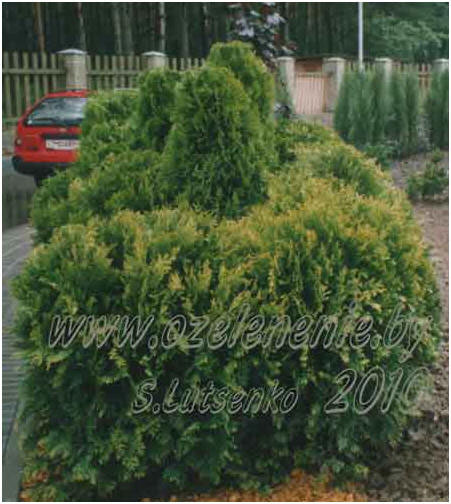Эти туи Корник (на переднем плане - с золотистыми кончиками) немного постригли. «Рейнское золото» (или «Рейнгольд») - невысокая (до 1,5 м.) туя с хвоей желтого цвета. Молодые побеги – ярко-лимонные, а зимой и осенью растение становится золотым, иногда – с красноватым оттенком. Золотистокончиковые туи (молодые побеги - жёлтого цвета) всегда имеют в своём названии приставки –gold (англ. «золото») или aurea (лат. «золотая»), иногда sun- (англ. «солнце»). Или обычное yellow- (англ. жёлтый).