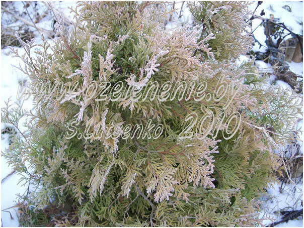 К зиме туя Рейнгольд меняет свою окраску, но всё же остаётся гораздо более яркой, чем её сородичи других сортов.