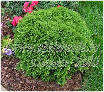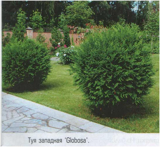 С туями конической и колонновидной формы, как зелёными, так и золотистыми, хорошо сочетается туя шаровидная. Сорт «Даника», например – это компактная, плотная туя; шарик диаметром до 80см. По фактуре своей она похожа на «Smaragd». Более рыхлые «Globosa» вырастают до 1,2 м. в диаметре, хорошо сочетаются с «Брабантами», и приобретают свою привлекательность с возрастом. Растут довольно быстро. Туя западная «Globosa» также продаётся всеми отечественными питомниками. Туя Даника (Danica).
