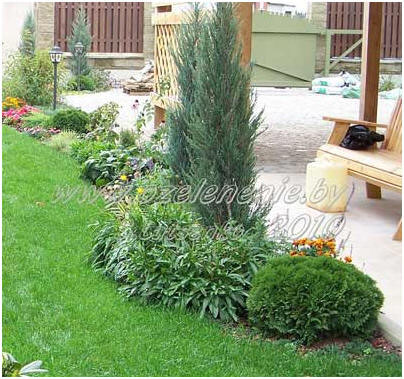 На фото слева - живая изгородь из туи Смарагд высотой 1,8 м. Более высокие туи с золотистыми кончиками - сорт "Еллоу Риббон" (здесь - высота 2-2,2 м.). Справа на переднем плане - три туи "Рейнское золото".