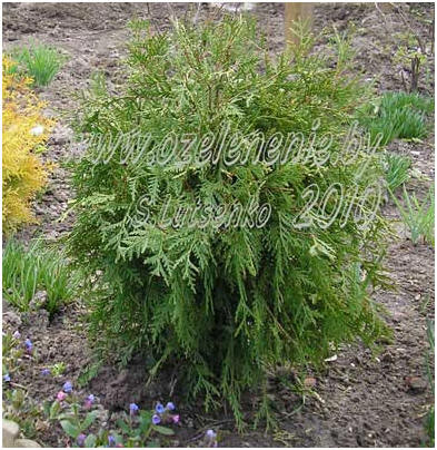 Туя западная Рейнгольд (Rhaingold) она же "Рейнское золото" или "Золото Рейна". Молодой саженец. Лето.
