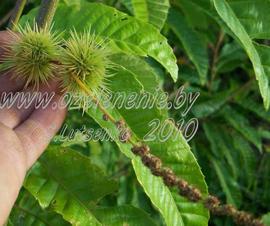 * Дополнение от 2014-го года. Мои собственные растения плодоносят уже несколько лет. Выращены они из семян, посеянных в 2004-м году. О том, что опылитель должен быть другого сорта, я узнала из литературы. Фактически же оказалось, что в плодоношение у меня вступили только растения ОДНОГО вида: каштан зубчатый. Это продукт американской селекции каштана посевного. Вкусовые качества, размер плодов и зимостойкость самого растения у Зубчатого каштана – гораздо выше, чем у первоисточника. Так вот, два одинаковых зубчатых каштана прекрасно опыляют друг друга. Собственно Посевной каштан – растёт, но пока не цвёл. И листва у него помельче. Сейчас мы реализуем саженцы только Зубчатого каштана, полученные из собственных семян. Что касается зимостойкости: молодые саженцы за все эти годы подмерзали у меня всего 2 раза. Поэтому я считаю, что обязана предупредить вас об этом. Каштан отлично отрастает вновь, если макушка его была повреждена или подмёрзла. Просто обрежьте повреждённую часть, и ждите. Говоря научным языком, этот вид каштана отлично размножается так называемой «пневой порослью», то есть, новые побеги появляются от пня, если растение срезано. И, замечу, мощные побеги! Поскольку с возрастом, подчёркиваю, морозостойкость растения повышается, укрывать молодые саженцы, однозначно, НЕ рекомендую. Так они легче привыкнут к условиям вашего участка ДО вступления в возраст плодоношения. Несмотря на то, что каштан съедобный пришёл к нам «с юга», растение это живучее и надёжное. Никаких сверхъестественных забот не требует. Посадите его на светлое место. Хорошо, если с севера и запада (от холодного ветра) растение будет защищено постройками или другими растениями, можно вечнозелёными. Поливайте и подкармливайте так же, как другие плодовые деревья. Для формирования кроны можно делать лёгкую обрезку (иногда, раз в один-два года, подрезать кончики длинных ветвей). И всё, пусть растёт! Хочу отметить, что таким огромным, как на фотографии внизу, съедобный каштан в нашем климате не вырастет. Не только в Беларуси, но и в более тёплых странах Европы, съедобный каштан скорее напоминает крупный кустарник, чем дерево. Хотя у него есть центральный проводник, ярко выраженный, каштан склонен к ветвлению. Красивым серебристым стволом вы можете любоваться, когда каштан зубчатый сбросит на зиму листву. С листьями же выглядит, как куст. Кстати, листва у этого растения очень симпатичная – крупная, жёсткая, тёмно-зелёная, с глянцевым блеском. Это растение в любом виде – украшение участка. В нашем «Каталоге растений» представлены фотографии только нашего собственного Каштана Зубчатого (съедобного). Возраст в 2013-м году – 9 лет, плодоносит уже 4-й год. (В первый год плодоношения семена не вызрели, теперь – вызревают). В свежем виде – очень сладкие и вкусные. Поэтому, не давайте каштанам осыпаться – у вас будет много конкурентов на эти плоды (птицы, мыши, любые мелкие животные). Собирайте каштаны сразу, как только колючая оболочка слегка треснет (см. фото в Каталоге). Так цветёт взрослый каштан посевной (съедобный). Тридцатисантиметровые "свечи" вблизи выглядят ещё более эффектно!