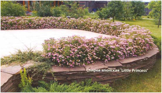 Но не только стелящиеся формы растений помогут вам «закрыть землю» на альпийской горке или между другими растениями. Обратите внимание на компактные и низкорослые карликовые формы различных кустарников. Это может быть спирея японская “Alpina” («Альпийская»), “Little princess” («Маленькая принцесса»). Лично мне очень симпатичны карликовые барбарисы с красной, оранжевой и даже пёстрой листвой. Кустарники такого рода имеют плотную подушковидную крону высотой, как правило, не более 25-40 см. Посадив их на небольшом (но достаточном для жизни) расстоянии друг от друга, вы получите тот же эффект, которого ожидаете от стелящихся растений, но значительно быстрее. Спирея японская Little Princess.