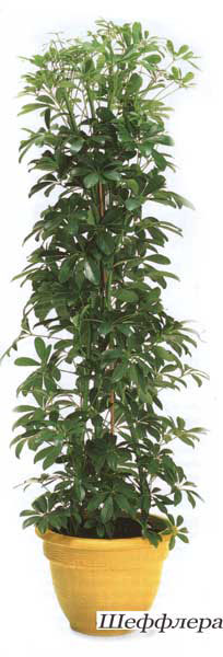 Шеффлера – оригинальное и очень выносливое растение. Листья – «ладошки» оригинальны даже у зеленой шеффлеры. А пестролистная форма – просто притягивает восхищённые взгляды, поднимает настроение! Светлая и прохладная (12-20º С) комната придётся ей по вкусу. Землю в горшке с шеффлерой надо поддерживать во влажном состоянии, а листья периодически опрыскивать. Если вы все-таки недоглядели, и шеффлера сбросила листья – поухаживайте за ней, и она обязательно восстановится. В этом цветочном горшке не одно, а несколько растений. У шеффлеры довольно тонкий и высокий ствол, поэтому она нуждается в дополнительной опоре. Высаженные группой, растения успешно поддерживают друг-друга, а заодно образуют пышный, густооблиствлённый куст.
