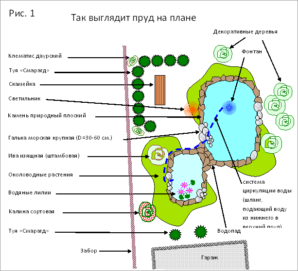 Пожелания заказчика: пруд прямоугольной формы, с фонтаном и водопадом. Размер основного пруда 3,5 Х 5 м. Глубина – около 1 м. В работе нужно максимально использовать имеющиеся камни (эх, я бы предпочла другие, но условие таково, что поделаешь!), а в материалах и растениях – красный и розовый цвет. Около пруда должно быть место отдыха со скамейкой. Итак, приступаем: На плане участка размешаем пруд (рис.1). Прямоугольная форма – это красиво, но с общей концепцией благоустройства и озеленения участка не совпадает. Поэтому слегка закругляем углы. К основному пруду присоединяем дополнительный, маленький. Этот пруд будет немного приподнятым, из него и будет вытекать водопад. В большом водоеме установим фонтан. Значит, водяным лилиям в нём будет не слишком уютно – эти растения предпочитают более спокойную воду и немного тени. Поэтому лилии высадим в верхнем пруду. Лёгкую тень обеспечим миниатюрными оригинальными деревьями (1/3 пруда должна быть притенена), тогда пруд хорошо выглядит и, как живой организм, чувствует себя лучше. Рассчитываем глубину пруда: глубина должна составлять 1/6 меньшего измерения (ширины) или 1/3 радиуса пруда. Такое соответствие соблюдается потому, что мы не бетонируем котлован и нужно, чтобы под плёнкой грунт не осыпался. При более крутом наклоне возможны повреждения весной, после оттаивания грунта (рис.2) Размер пруда у нас 3,5 Х5 м., значит глубина 3,5 / 6 = 0,6 м. Копаем котлован. Грунт оказался глинистый, тяжёлый, и очень сильно утрамбованный машинами во время стройки. Можно немного увеличить глубину пруда, до 0,75м. Рельеф дна плёночного пруда.