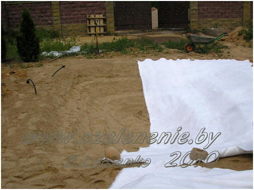 Самое трудное позади (фото1). Мы выкопали чашу пруда (кстати, на 5 см. глубже, чем расчётная глубина). Теперь начинаем укладывать подстилающие слои. Уровнем выравниваем верхний край пруда. Для того, чтобы плёнка не протиралась о мелкие камушки (крупные мы удалили), засыпаем дно и стенки просеянным песком. Слой песка, как вы уже догадались, 5 сантиметров. Рассчитываем нужное количество плёнки (в нашем случае это бутилкаучуковая мембрана толщиной 1,0 мм.): ширина = 3,5 + 0,75 +0, 75 + 1 = 6 м. Длина пруда = 5 + 0,75 + 0,75 + 1 = 7,5 м. Отлично! Можно приобрести 7,5 м. плёнки шестиметровой ширины. Минимум отходов! Столько же нужно и фетра. Фетр – плотное нетканое полотно, которое защитит плёнку снизу от острых песчинок. Стоимость его – 1,5 – 2 евро за м². Хочу отметить, что какую бы вы не использовали плёнку, её обязательно нужно защитить снизу! Если не фетром, то любым нетканым полотном – синтепоном или даже ватином (можно купить в любом магазине, где продаются ткани). Нетканое полотно сшивать не нужно. Просто подстелите его, чтобы плёнка не лежала на песке (фото 2).