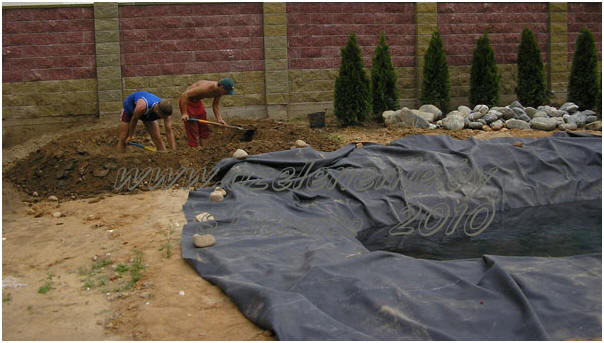 Укладываем мембрану (аккуратно, чтобы при перетаскивании фетр под ней не скрутился). Там, где необходимо, делаем складки. Края плёнки пока закреплять не надо. Сначала наполним пруд водой, чтобы плёнка приняла нужную форму, прижалась к дну и стенкам чаши пруда, не растягиваясь (фото3).