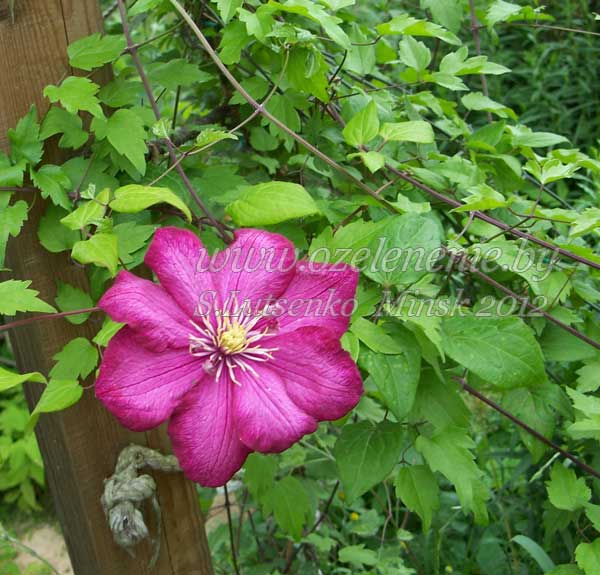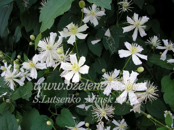 Каталог деревьев и кустарников для Минска и Беларуси (А-Я)Клематис (clematis)Существует более 2,5 тысяч сортов клематиса, и большинство из них отлично растут в нашем климате. Если говорить о сроках цветения: есть клематисы, которые цветут один раз в году, весной или осенью, бывают повторноцветущие. Некоторые клематисы цветут продолжительно, в течение нескольких месяцев. Что касается роста - то и здесь разнообразие велико. От кустовых клематисов, ростом до 1 метра, до "бесконечных" лиан, дающих по 6-8 метров прироста в год. Существуют клематисы, которые нужно обрезать ежегодно, так же, как существуют клематисы, которые вообще не нужно ни снимать с опоры, ни обрезать. Поэтому, если вы решили посадить клематис - определите для себя лично, растение какой высоты вас устроит, какого цвета и размера должны быть цветки, в какое время он должен цвести, хотите ли вы его обрезать на зиму, или (о, ужас!) укрывать. Когда определились со всеми характеристиками - просто подберите соответствующий сорт, благо выбор есть. Или, покупая растение, уточните его собственные параметры. Разные сорта с одинаковыми цветочками будут отличаться друг от друга по остальным признакам. Одна общая рекомендация: огромную яму (1х1х1 м.) для малюсенького саженца выкопать всё же придётся. Это нужно сделать для того, чтобы клематис смог легко и быстро в разрыхленной земле образовать много корней. Иначе - очень долго придётся ждать цветения. Корни клематиса желательно притенить. А вот в качестве опоры подойдут: пластиковая сетка, шпагат, проволока, и даже (если это не противоречит дизайну сада) простые, некапризные деревья и кустарники. Клематис - лёгкая (не тяжелая по весу) лиана, и существенного вреда другим тен не причинит.