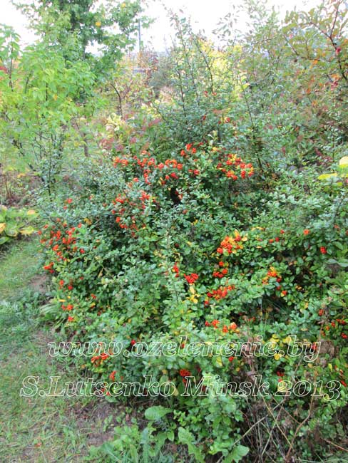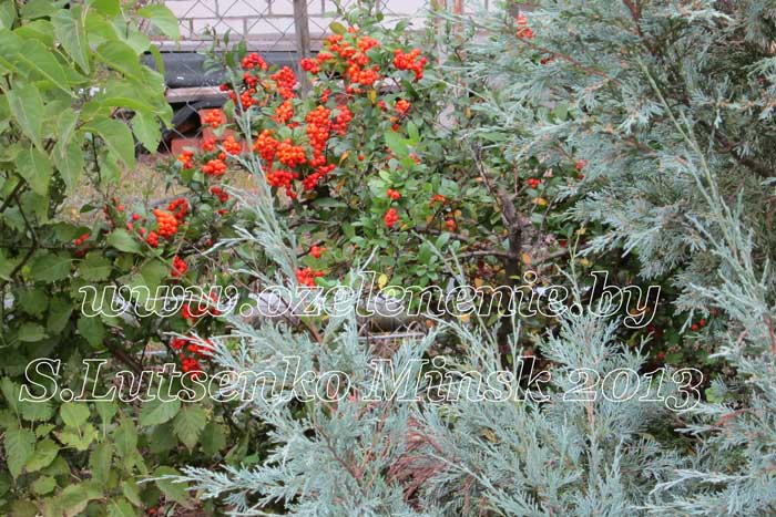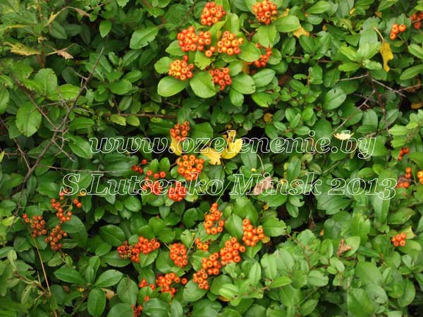 Каталог деревьев и кустарников для Минска и Беларуси (А-Я)Пираканта (pyracantha)Декоративное растение. Жёсткий кустарник с крупными шипами. Пригоден для создания непроходимых живых изгородей. Может выращиваться, как прямостоячий куст, или взбираться по опоре, как лазающая лиана. Плоды несъедобны, но очень декоративны, особенно в массе. Держатся на ветвях до середины зимы. Пираканта ведёт себя, как полувечнозелёный кустарник. Та часть растения, которая зимует под снегом, листья не сбрасывает, оставаясь вечнозелёной. В верхней части куста (выше снегового покрова) ветки оголяются, а молодые листочки вырастают весной. Пираканта отлично подходит для всех видов стрижки и формирования.